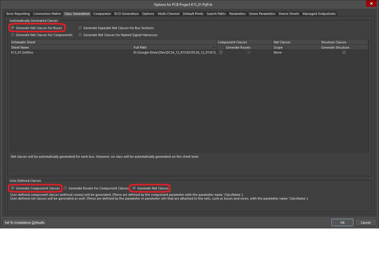 Hello guys. May you help me with component/net class generation from PCB? If I create net class by adding parameter to some nets it will work, if i add parameter to coomponents "ClassName", it will also work. When i try create classes from PCB (Design > Classes), I can't update schematics with that classes. In Project options I have selected: generate net classes & componnet classes. What Is wrong?))