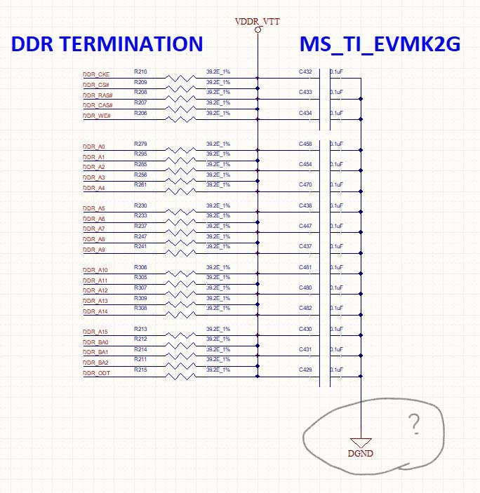 2-- In second schematic termination resistors with capacitor other end connected with "1.35V" net name (VDDS_DDR_K2G). instead of "DGND".