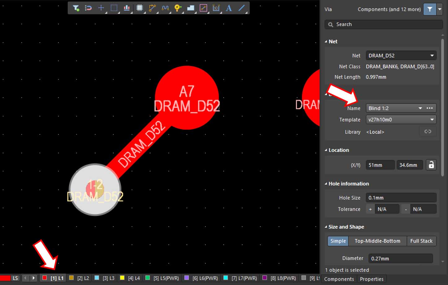 I did the PCB stack-up and I defined a Blind via between L1 and L2 (i.e., Blind 1:2).
