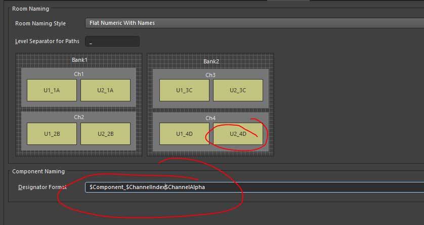 In channel 2 Altium places a new part as U4_2 but I want it U4_1B. Do you know how can I do that?