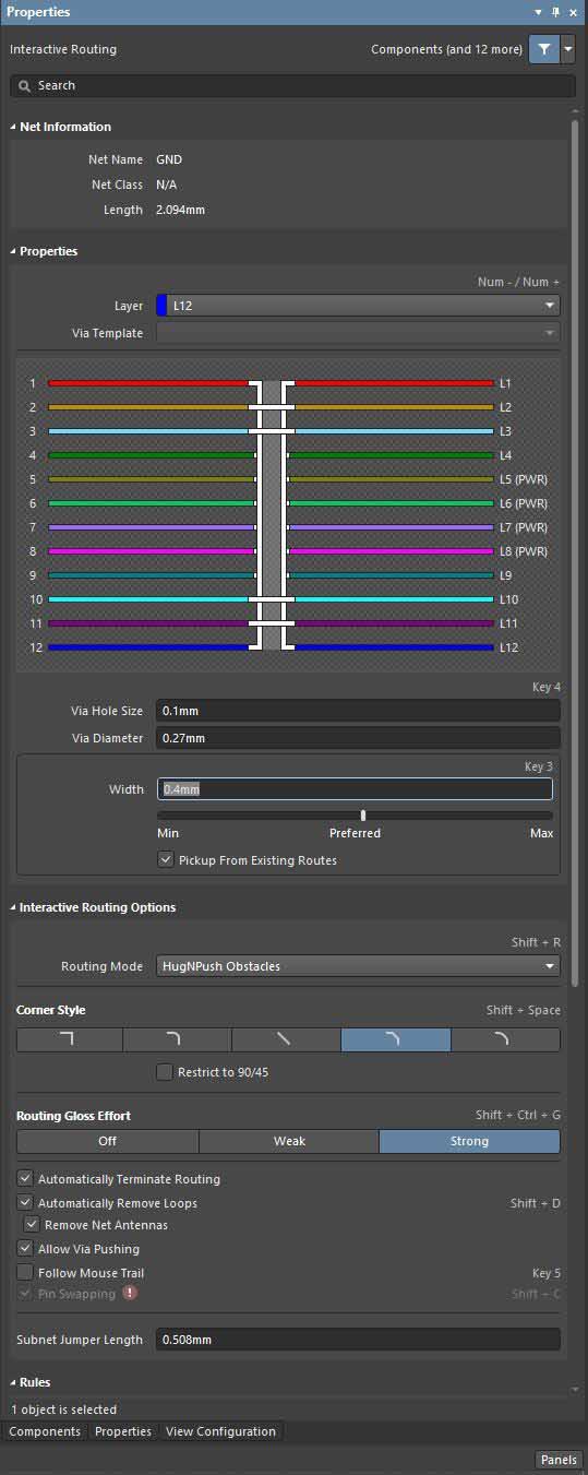 Now when I put down a trace starting from a GND pad and want to add a via, instead of putting down a thru-hole 1-12 via by default, it gives me a stack of two vias (L1 to L2 and L11 to L12).