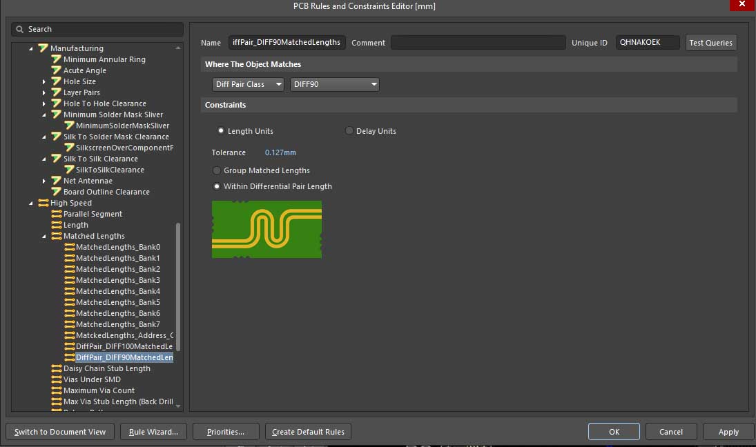 I created a rule: MatchedLengths_BetweenPairs and applied it to Diff Pair Class > Display_Diff.