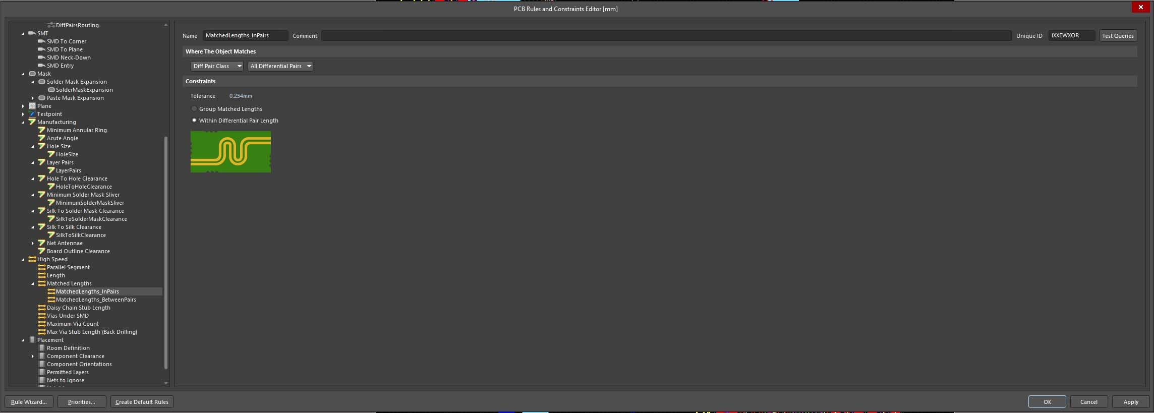 While entering the different rules for Length Matching Between Pairs, I started entering this BetweenPairs rule "HDMI0_OUT" pointing to all differential pairs.