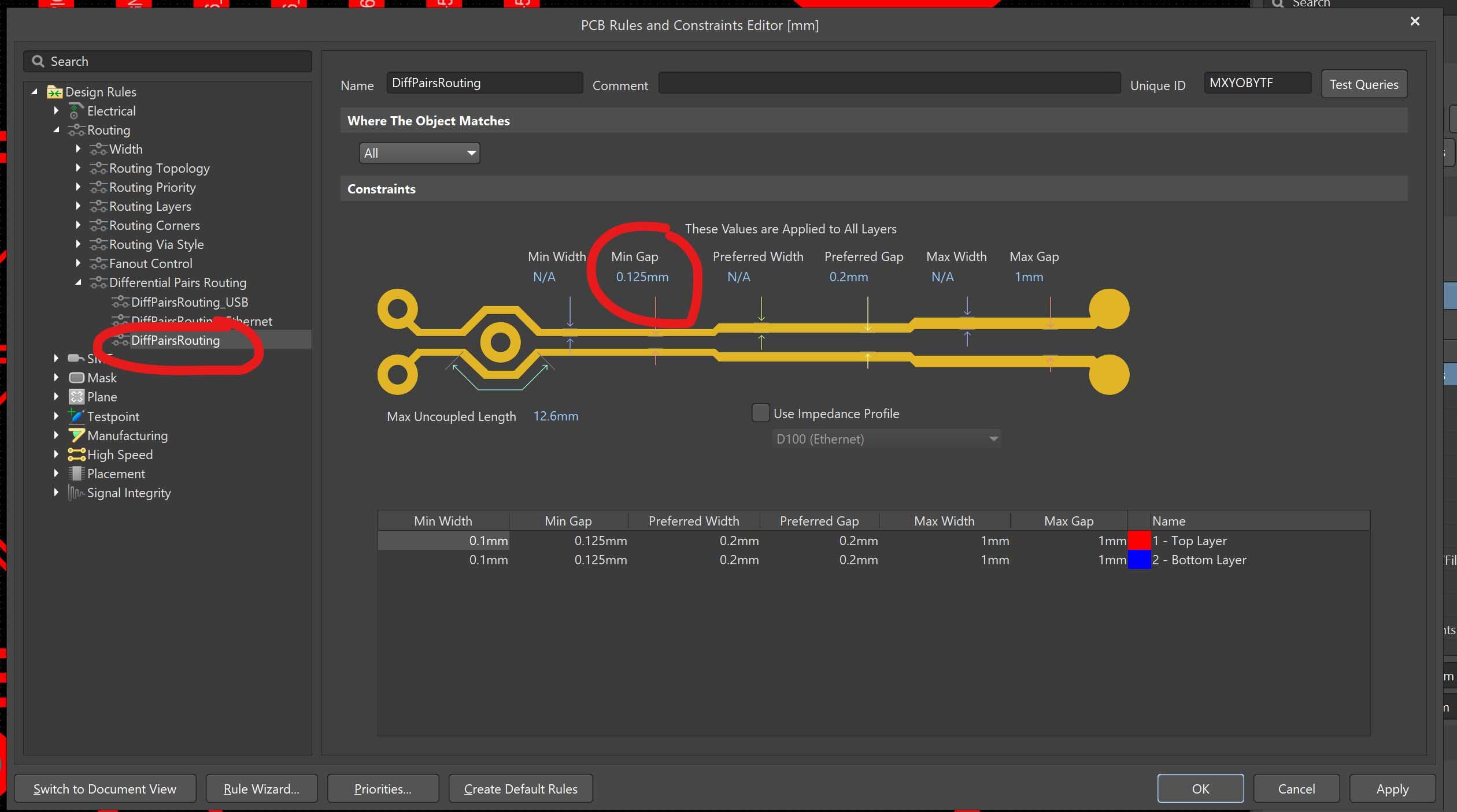Hi, I have a problem with differential tracks. I created an impedance profile for 100 ohm differential and set a rule to use it.