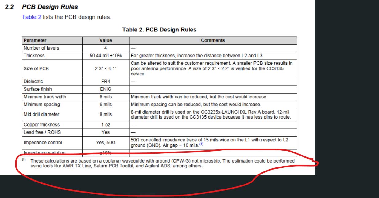I am working with a reference PCB design. My reference PCB design is launchxl-cc3235s simple-link WiFi cc3235s dual band launch pad development kit. I have altium file of this, with reference guideline PDF. It is said in the guideline of this PCB board that the control impedance is 50 ohm. It has a total of 4 layers. Image of layer stack-up is given below. I have done the impedance calculation for 50 ohm according to the layer stack-up of this PCB board in altium designer.Here the trace width for 50 ohm impedance is 17mils. But in my reference design the maximum trace width is 6mils .Now my question is where the trace width is 17 mils with 50 ohm impedance, why is 6 mils given in the reference design? It is normal that the trace width will be large in high current trace, but why did it give normal signal trace width 6 mils? why not 17 mils for 50 ohm impedance?