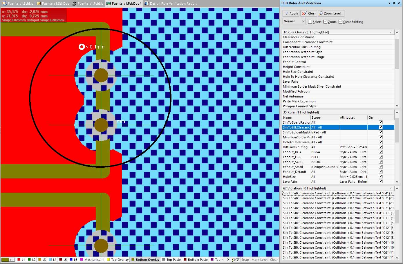 Hi guys! During Switching Power Supply course I found a problem with two errors in particular that I can't avoid!. It seems like Altium doesn't allow to overlap "text" (of the component, hidden for a more comfortable design) with a via or a bottom/top overlay layer (Silk to Silk error Clearance constraint). I believe this is not important as Robert did not have bottom overlay visible during design. Also, I get another error when overlaping text with pads of any component (Silk to Solder Mask error). What'silk? Sorry for these new starter questions; I'll let the pictures describe what's going on. THANKS A LOT!