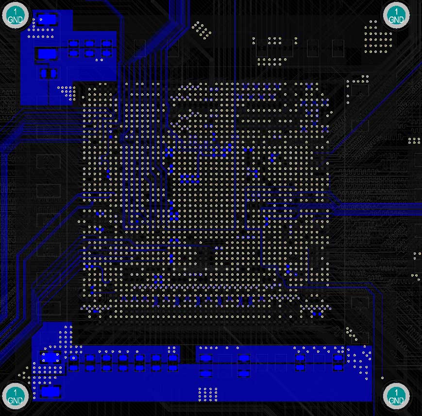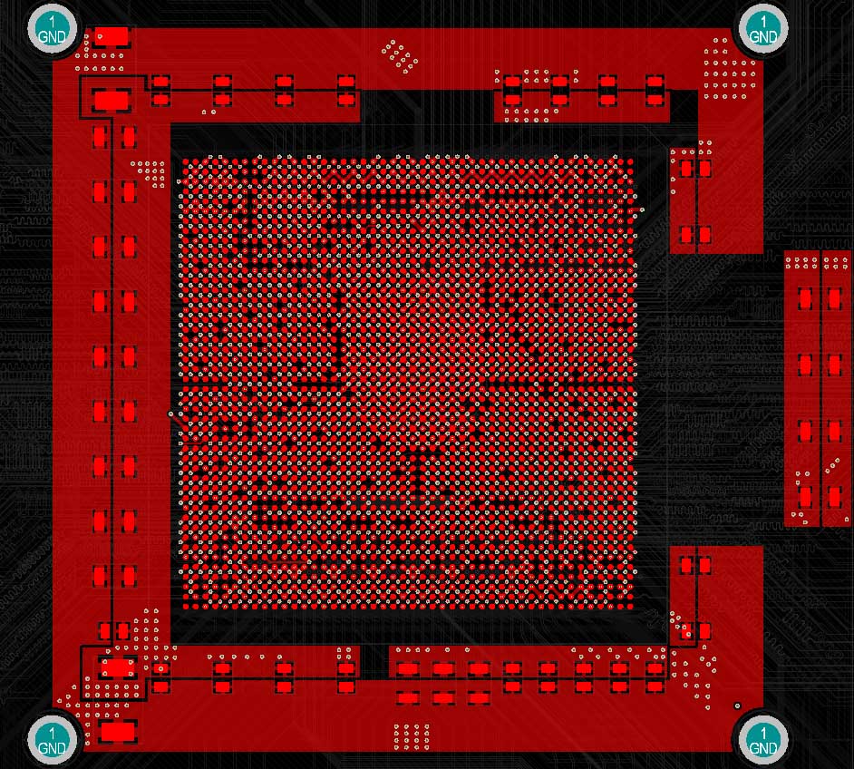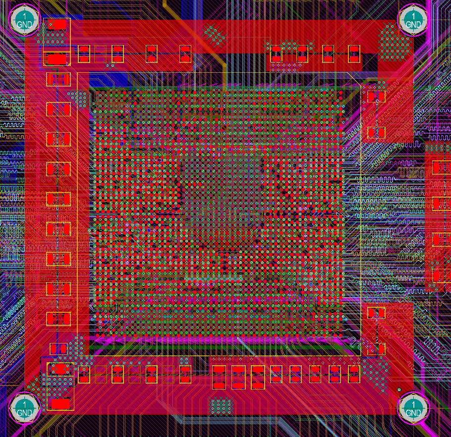 I have the example CPU board and in the picture below there is a small section of the area under the BGA. I have some issues with the length of the total path that the charge will need to travel. If you look at the picture attached, and please forgive my attempts to draw in "Paint", observe the green line. It starts at the H14 Pad and simulates where charge would be "likely" to go in a path from the voltage pad to the ground pad of the BGA. Starting at H14, charge (lets not quibble about positive charge vs negative charge) flows, at best, to the via then to the cap positive pad, then through the cap (not really, but lets go with it for the purposes of the argument) then to the GND pad of the cap, up through the GND via and finally ends at the GND pad of the BGA. That seems like a lot of path to travel. I have seen boards radiate at say 333 MHz where the radiation was stopped by tacking a 201 Cap in the right place.