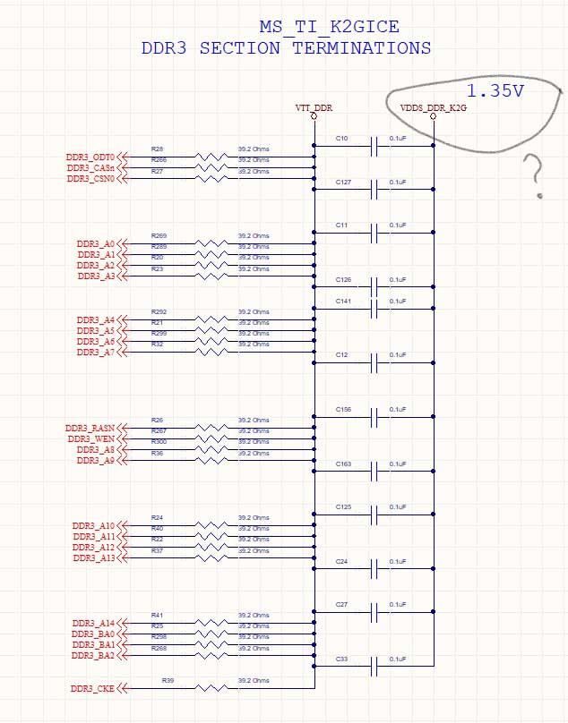 2-- In second schematic termination resistors with capacitor other end connected with "1.35V" net name (VDDS_DDR_K2G). instead of "DGND".