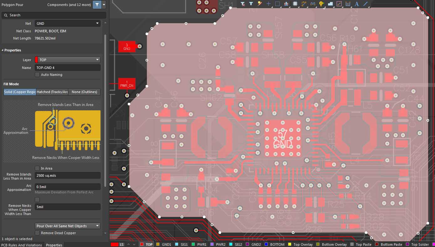 However, There are few sections in my design where polygon is poured continuously in between the pads.