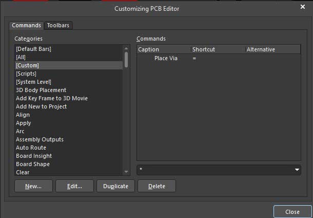 This would open a "Customizing PCB Editor" dialog box. Then click "[Custom]" and Place Via shortcut shall appear there.. (as shown in the attached image)