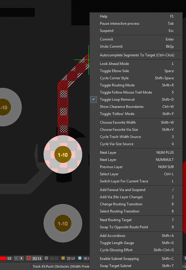 PS: One of the best commands in Altium is SHIFT+F1 - it shows available shortcuts. So, when you are routing, use SHIFT+F1 to see what you can do: