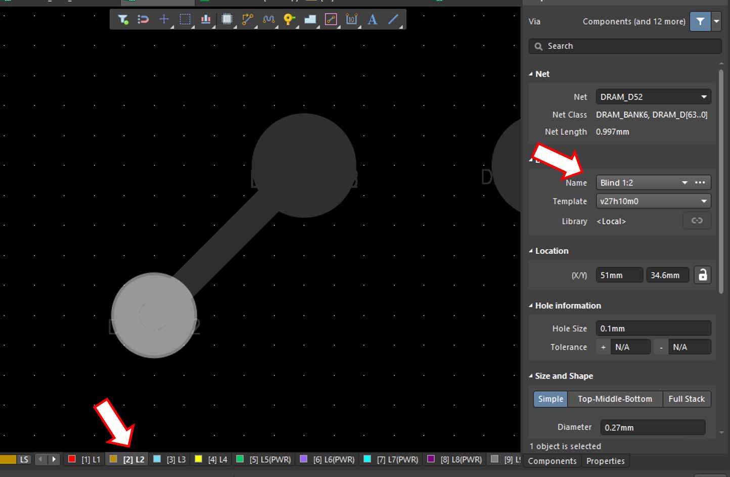 I did the PCB stack-up and I defined a Blind via between L1 and L2 (i.e., Blind 1:2).