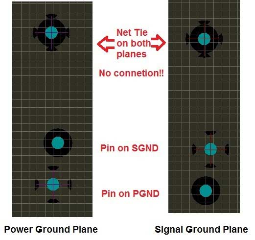 Cureently I am working on an embedded application for my Master Thesis and I would like to have your proposal on an important detail with ALTIUM (17.1). It is a 6 Layer Board with two separate ground planes, one for power modules and one for signals, which need to be connected at a single point. I used the “Net Tie component” from the section “Intentionally Connecting Two Nets”, found onhttps://www.altium.com/documentation/altium-designer/creating-connectivity-ad?version=17.1#!intentionally-connecting-two-netsSome usefull information also found:https://smtnet.com/library/files/upload/NetTies-and-How-to-Use-Them.pdfWhat I did was to create a new component, marking it as a Net-Tie. I took two pads and placed one exactly above the other, same size and same drill. I took this part on my PCB (after the proper connection on schematic) and it aligned with a power capacitor’s pin, connected to the ground. It seems that no connection takes place. I checked also the gerber files with View Mate and the look exactly the same.- So my question now is, which is the best way to connect two internal planes at a single point? Isn’t it beneficial to just use a drill that already exists on the board, by means of a component like electrolytic capacitor close to the main input? I haven’t seen it anywhere else though. With engineering greetings from Greece,KOVA