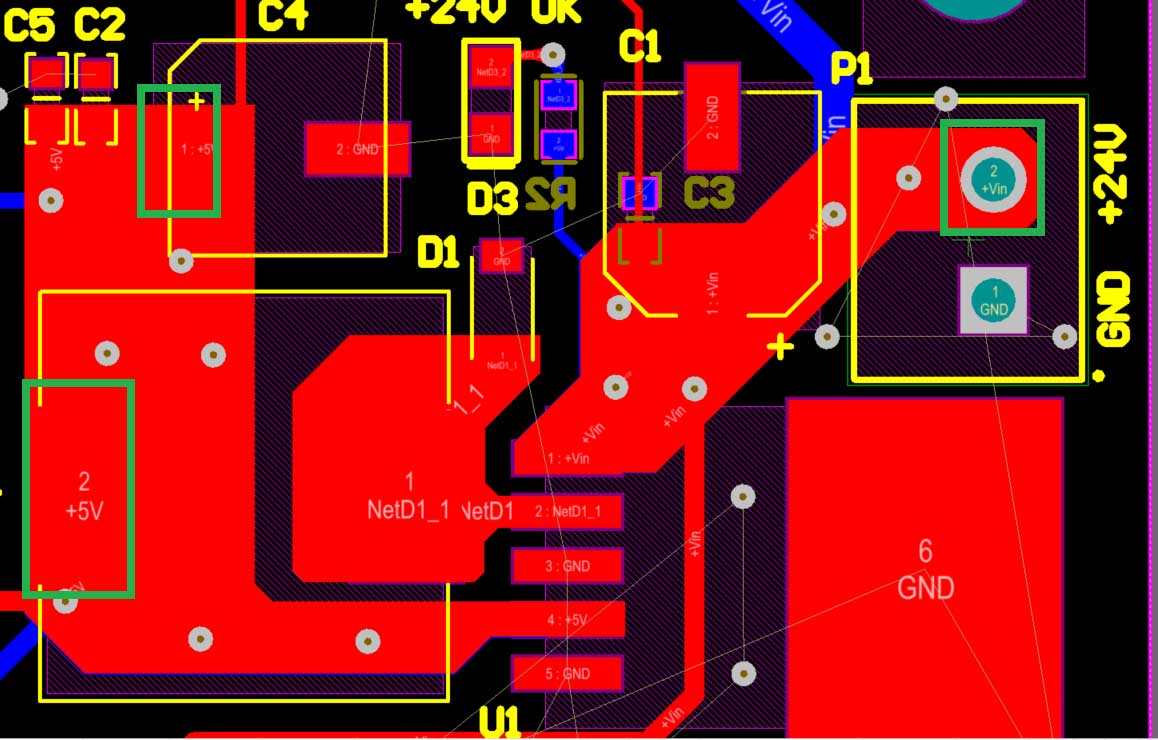 I'm trying to create some planes for a DC-DC converter IC ( TL2575 ) and i've used solid region for those planes ( Vin, +5V ).