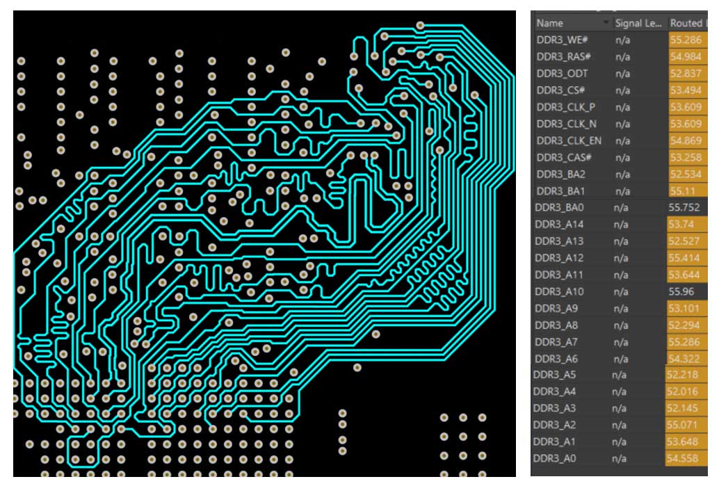 I'm trying to use the same layer for all of those signals and I'm trying to route the vias from the fanout of the FPGA directly to the vias of the fanout of the 1st DDR3.