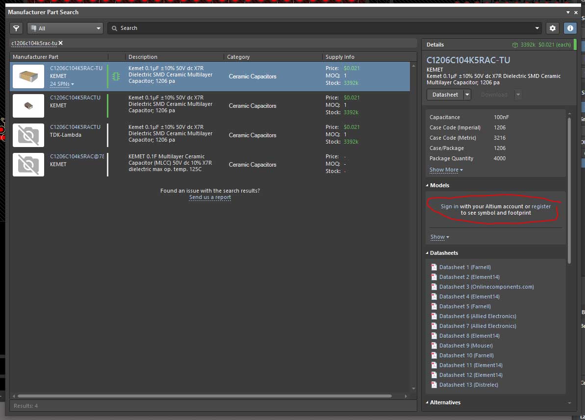 - many people are occasionally reporting this. Is it now working? Was it really a server error? PS: I think, for the components with green chip symbol, some models (schematic symbol, PCB footprint) should be available.