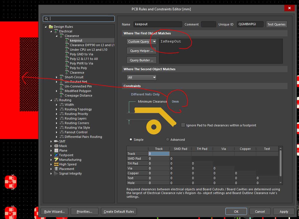Can anyone help, I am fairly new to Altium, I am trying to create a 0,3mm Radius keepout with copper restriction selected, for some reason the software is putting an extra clearance between keepout and copper area, is there a rule somewhere, so the copper will go right up to keepout ?