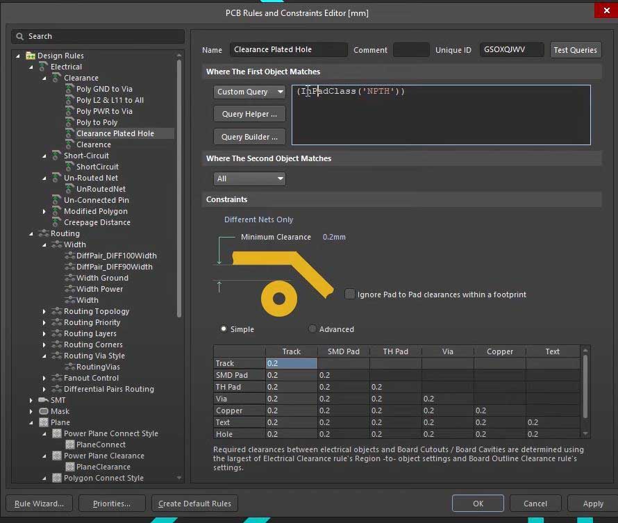 However, there is something that has been confusing me for a long time that I am hoping that you can clarify. When a Clearance Rule is defined, the "PCB Rules and Constraints Editor" has a table which shows many combinations of types of objects to each other. If the "first object" and "second object" are both "All", this table makes sense, it allows you to specify different clearances between different types of objects without having to create a different rule for each one, assuming that you don't want the same clearance for all object to object combinations. However, if you use a "custom query" which limits the objects that this rule applies to, the table may not make a lot of sense. For example, in the video, you specified a clearance which only applies to non-plated" holes objects (see attached snap-shot). Since the query limits the clearance rule to non-plated holes only, than it seems like the table does not apply anymore. For example, "track to track" would not apply since tracks are not non-plated holes. It almost seems like Altium should have just removed the table whenever a custom query which limits the types of objects which are being specified. Do you agree, or am I missing something?