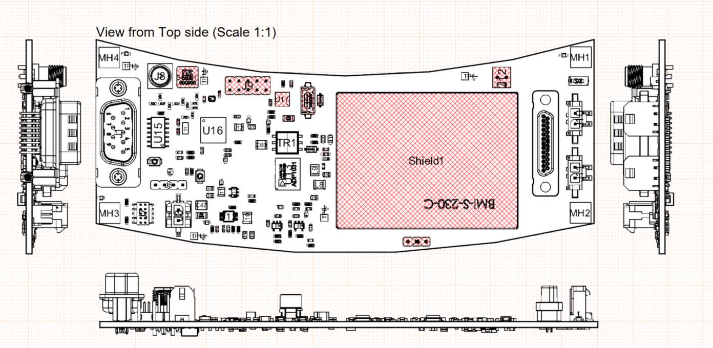 If you check the top view, the EMI shield is shown in RED but visible and blocking component beneath. If you check the side view, and front view the EMI shield is not shown, which is correct.