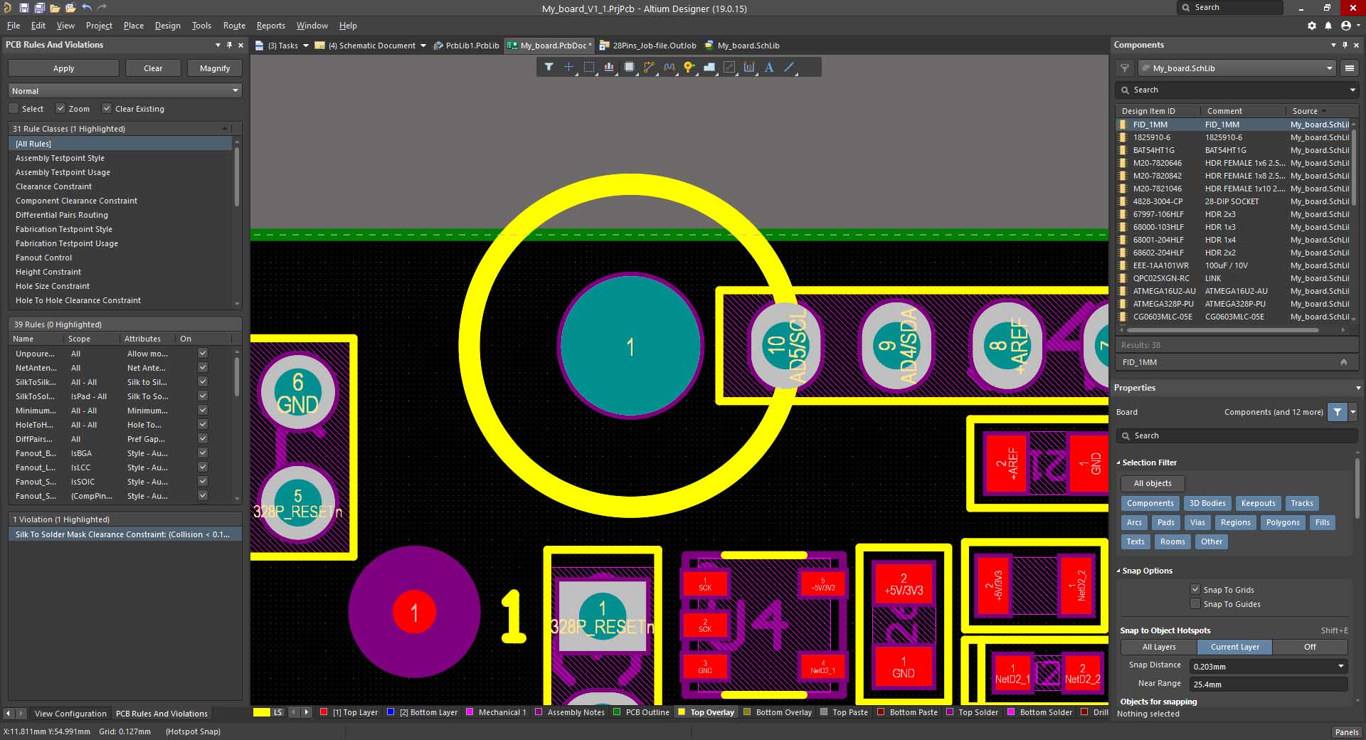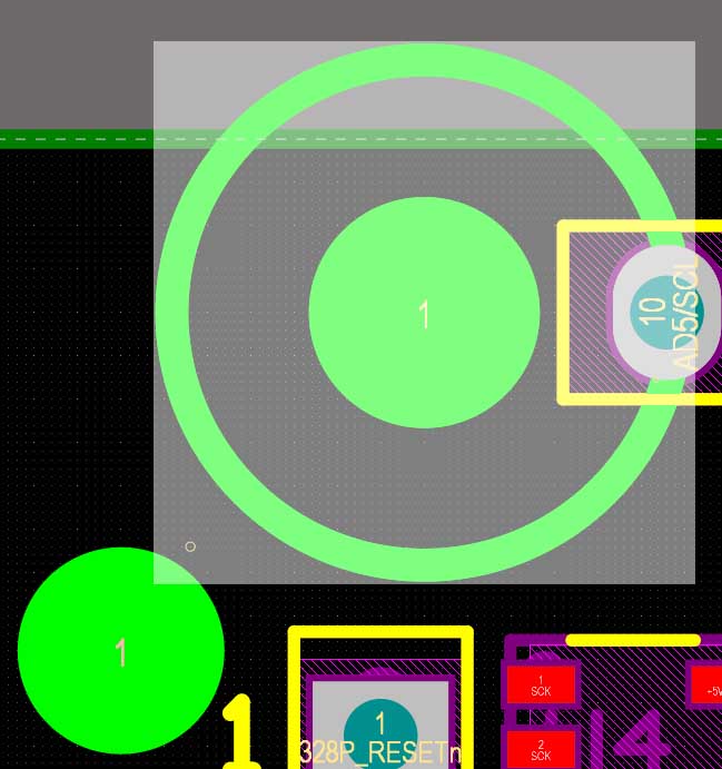 If the large hole is a component and the ring around the large hole is part of the component, then Altium thinks that ring, being part of the component, cannot be that close (overlapping) with the header (pin 10 AD5/SCL, etc.). What's the purpose of the ring around the large hole?