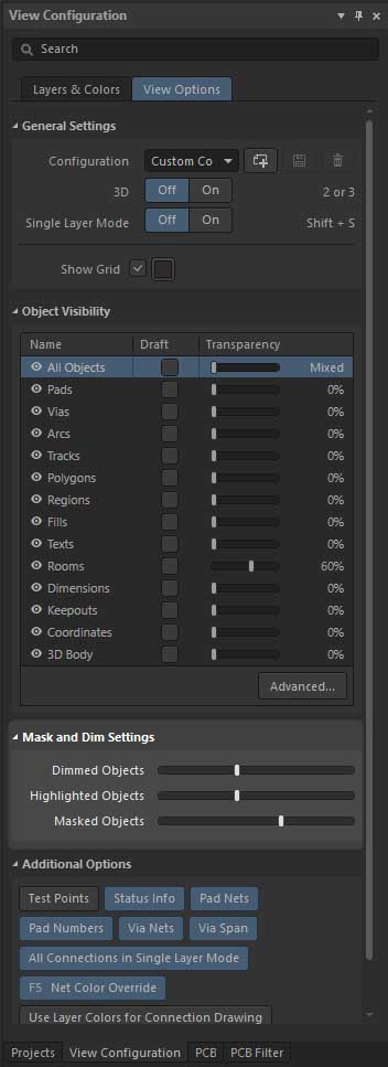 I was recently messing with this. A good way to get a handle on these controls is to use the PCB panel in nets mode. If you click on a net name, Altium wants to show you that net, and you can select whether the method to show you involves masking or dimming or whatever at the top of the PCB panel. Then you can use the controls that @przemek mentions to tune how it works. Not as easily adapted to an unrouted design, but I imagine you'll get the picture. Also, surprisingly, Altium has a pretty good help section explaining these controls too.