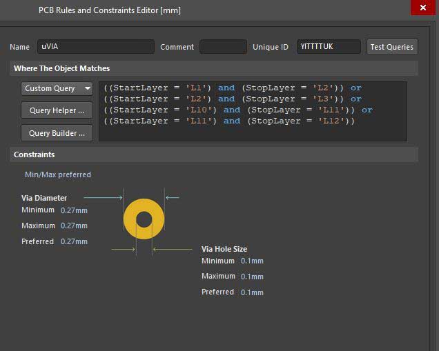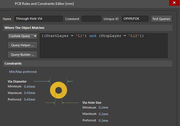 I am following the course advanced PCB design and am using Altium designer version 19.0.14. I am trying to do the fanout under the CPU and Altium will not let me create a via that is the default size as shown in the video. Here are my settings in Preferences -> PCB editor -> defaults -> Via: