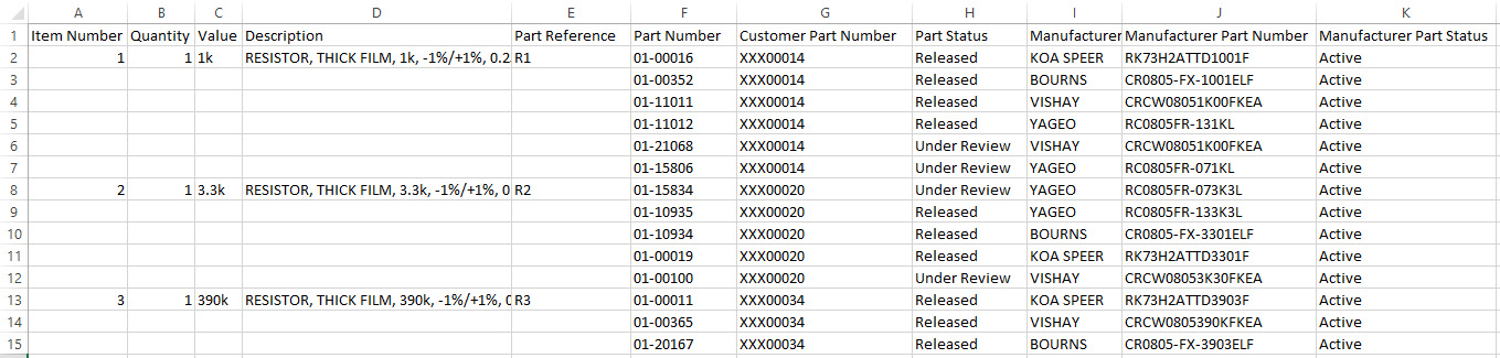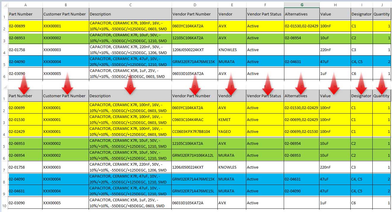 Anyway, now I got an example of how BOM with alternatives is generated using Cadence in my company. Attached is a screenshot and if possibe, I'd need to follow this pattern: alternatives are added in new rows, all using the same parameters. And the EMS can choose any component they want.