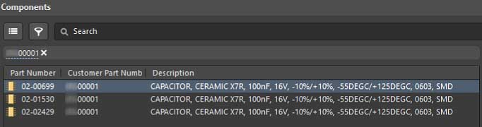 My customer is going to use my database, but additionally he wants his own part number "Customer Part Number" to be added. When he needs 100nF 16V 0603 capacitor, he searches for xxx0001, and then he sees all three above capacitors. In next step the customer chooses which component he wants to use and it's done.