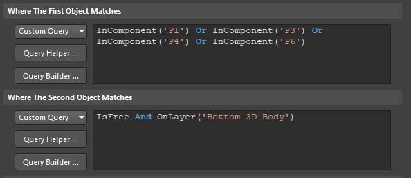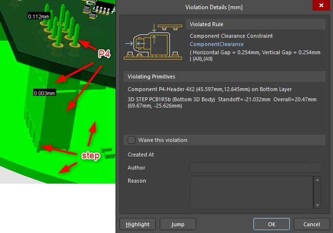 Any ideas how could I resolve this? I need a rule for Component Clearance that allows me to have 0 mm clearance between P4 and PCB1R5b step. But I don't know what expressions should be used.