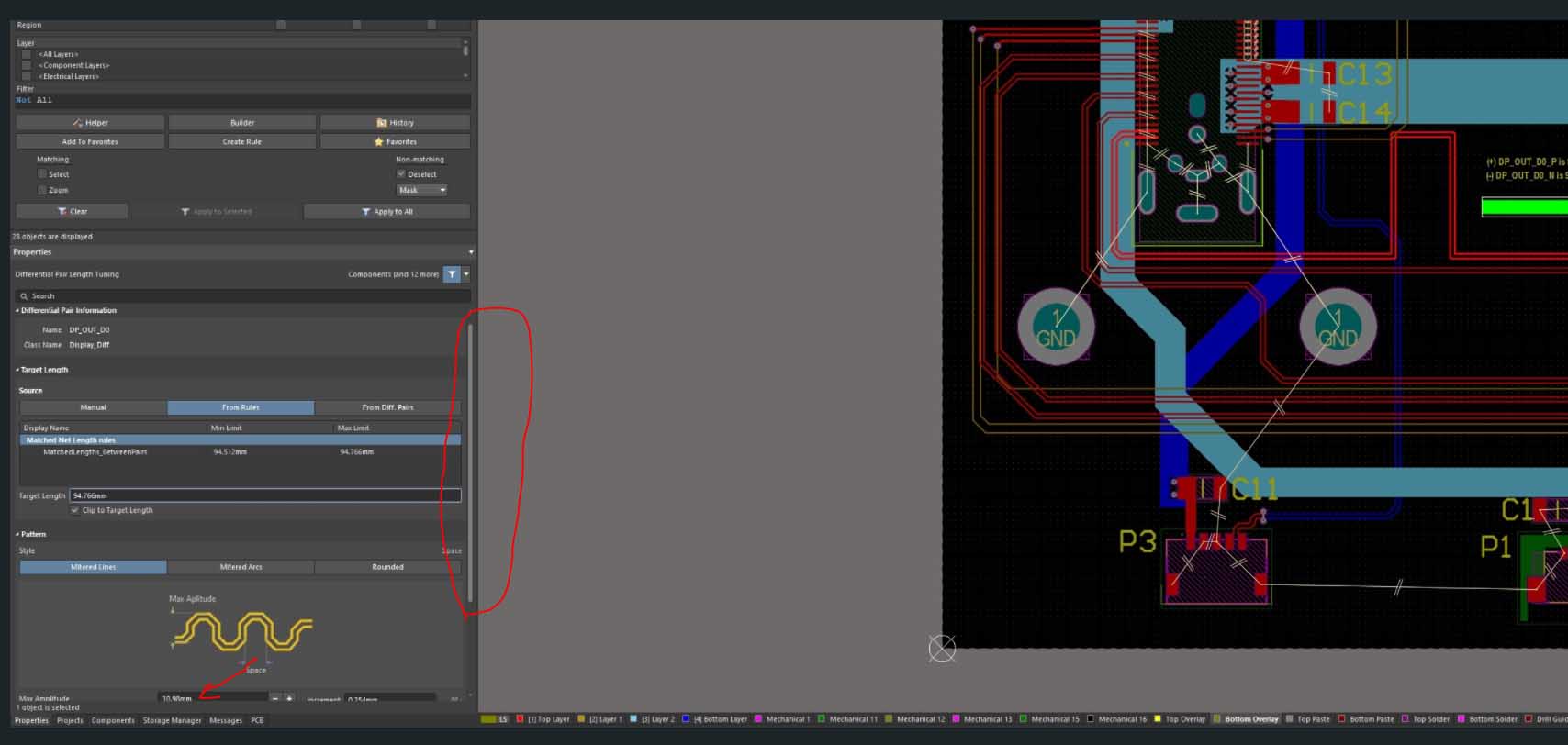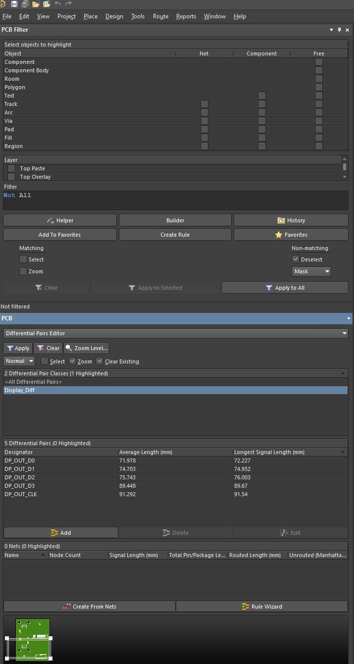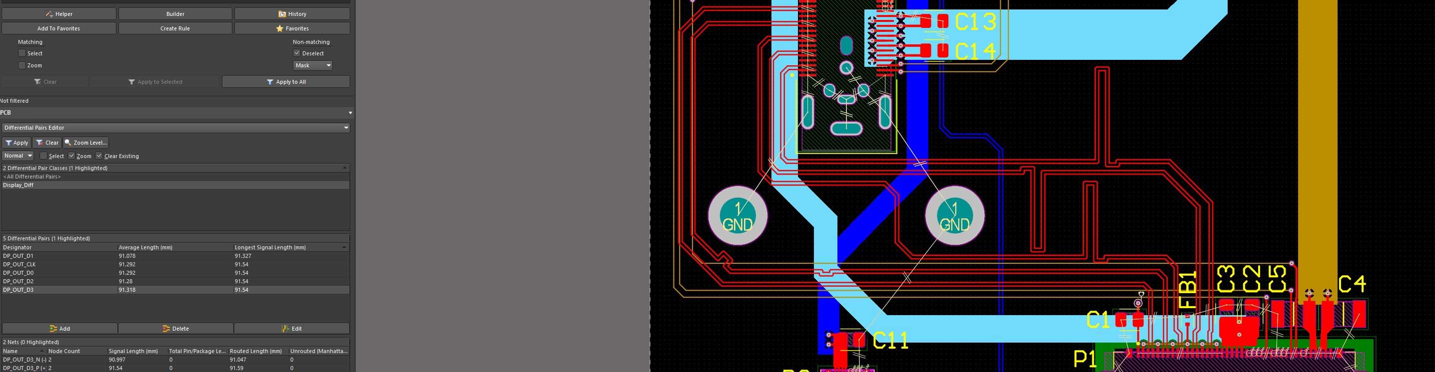 The Differential Pairs Editor shows that the pairs do not match with the rule (big differences between lengths).