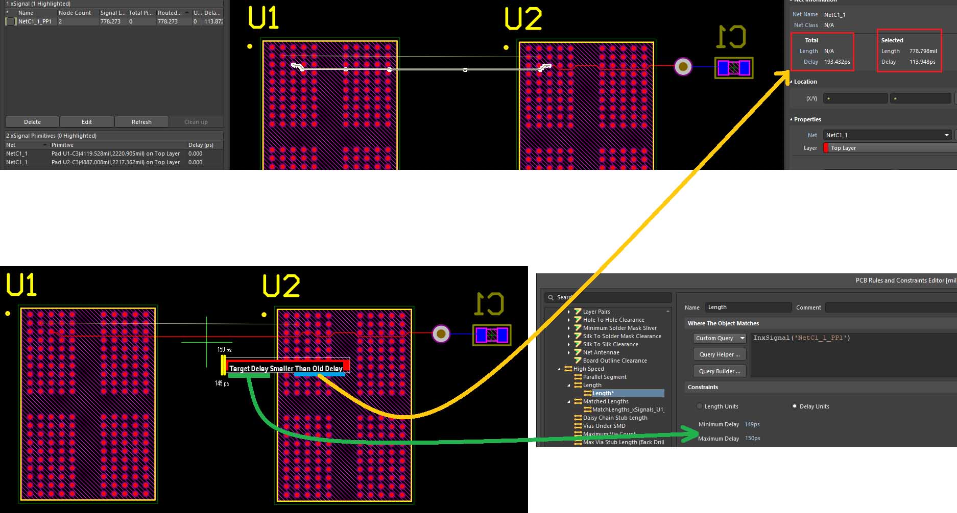 - I'm trying to implement xSignals on Altium. I created a test project with 2 ICs and a capacitor. I routed basic tracks between 2 IC pads and a capacitor pad. Net's total delay is 193ps and delay between IC pads is 113.9 ps. Lets say it must be 150ps so I created an xSignal between IC pads with min 149ps, max 150ps rule. When I'm trying to tune tracks in NetC1_1_PP1 xSignal with interactive length tuning tool, Altium says "Target Delay Smaller Than Old Delay". Probably it uses total net delay (193ps) instead of xsignal delay. How can I resolve this issue. Please see attached screenshot.