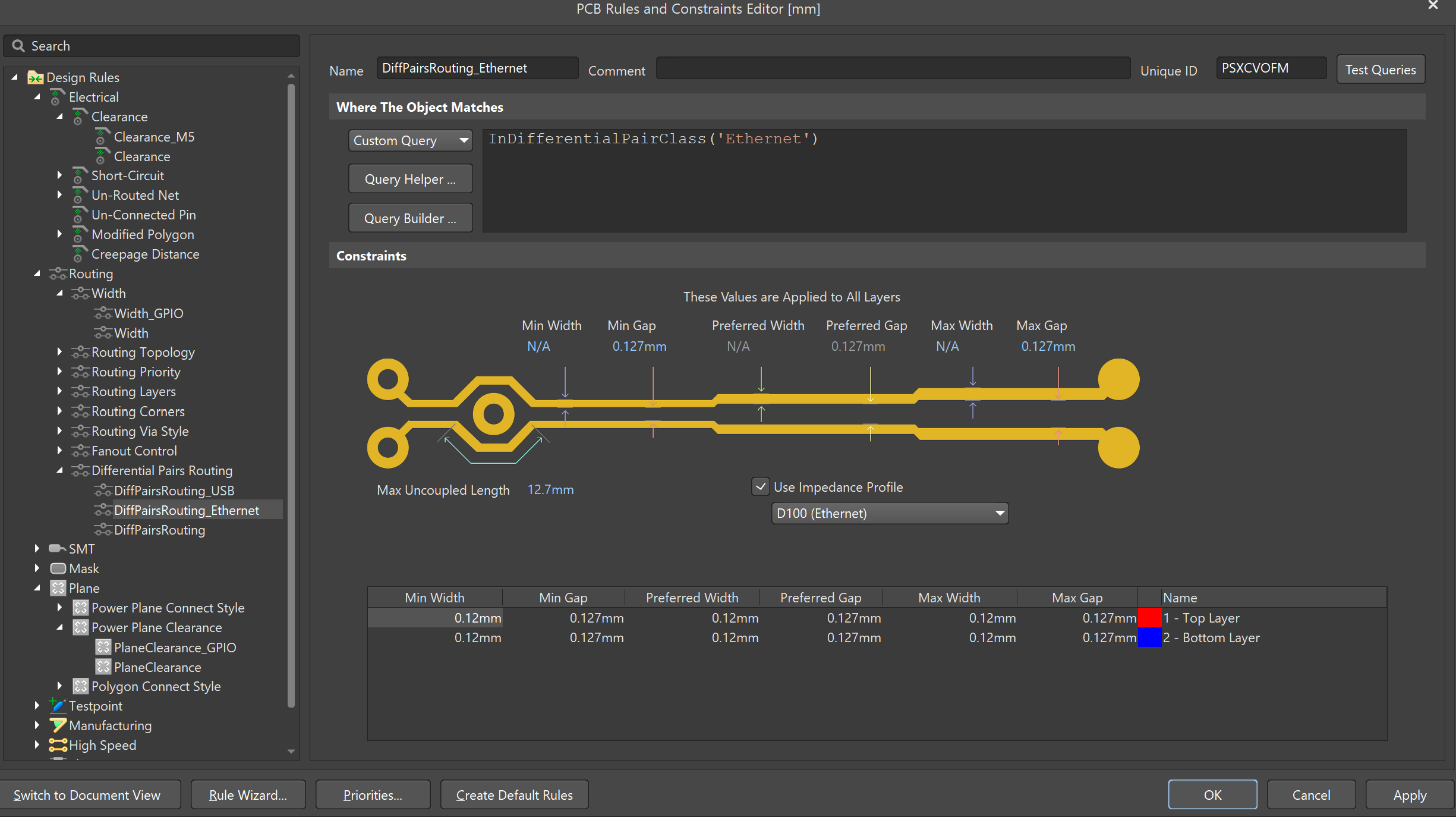 Hi, I have a problem with differential tracks. I created an impedance profile for 100 ohm differential and set a rule to use it.