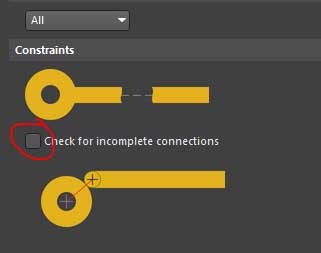 But the main reason for this error if tracks were not routing from center of pads origin this error will come. Eventhough, Tracks is barely touched the Component Pad, Routing is practically connected. But if you checked the incomplete connection option, altium completes routing of any net only it is traced out from exact center of the pad origin you may see that in picture also. Please try that.,..