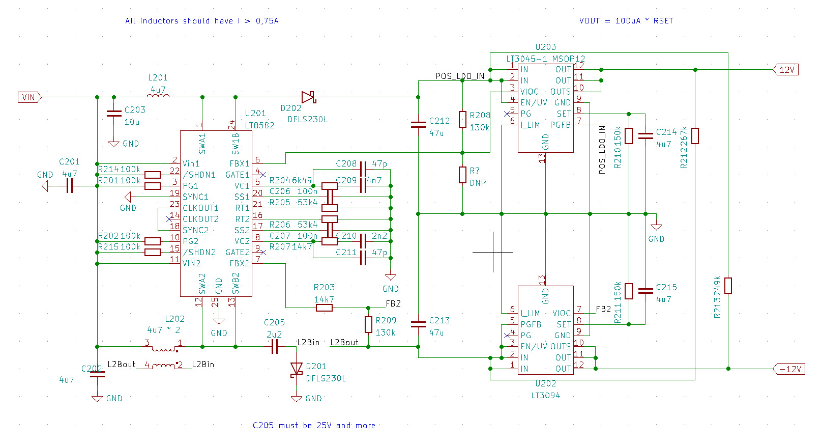 The analogue power supply is meant to be +/-15V, so half of the LT8582 works as a boost regulator (5V to 16,5V), another one as an inverting boost (5V to -16,5V). The next step is the LT3045-1 and LT3094 LDOs. they are supposed to work with minimal dropout, being in LT8582 feedback with their VOIC pins.