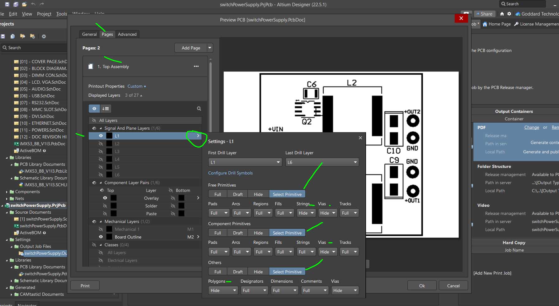 Lesson 6 > Video 22 Creating and adding a job file to project. This steps through a process of configuring a Manufacturing Output Job File to select the appropriate layer of the PCB (L1 for Top Assy) and show/hide specific PCB Objects, like polygons, vias, etc.