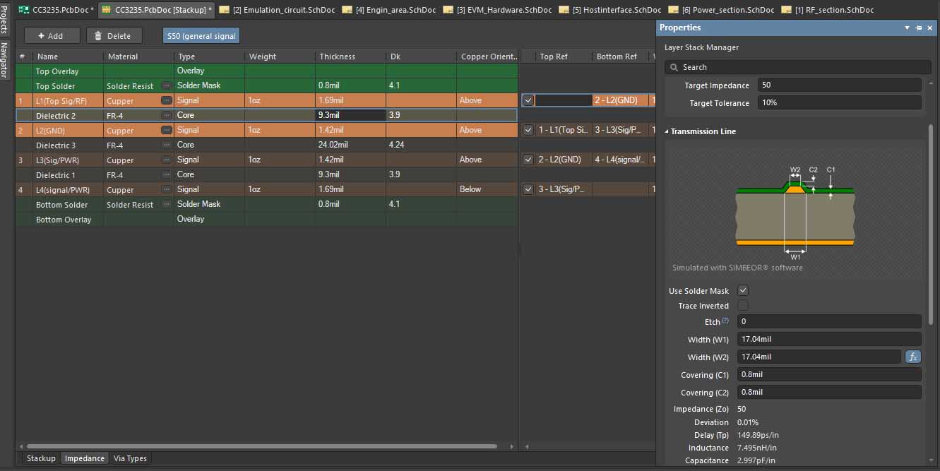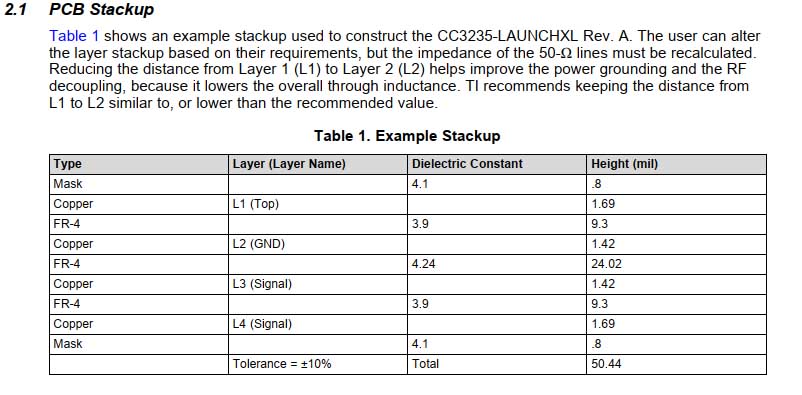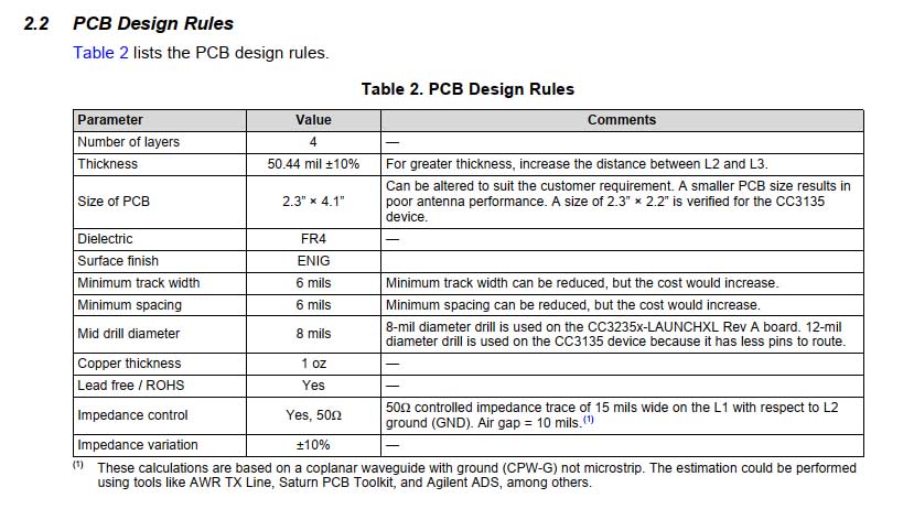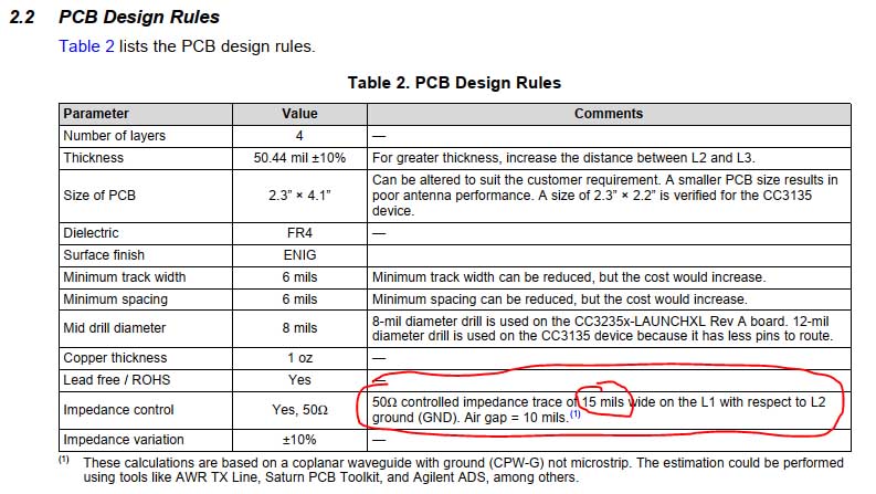 I am working with a reference PCB design. My reference PCB design is launchxl-cc3235s simple-link WiFi cc3235s dual band launch pad development kit. I have altium file of this, with reference guideline PDF. It is said in the guideline of this PCB board that the control impedance is 50 ohm. It has a total of 4 layers. Image of layer stack-up is given below. I have done the impedance calculation for 50 ohm according to the layer stack-up of this PCB board in altium designer.Here the trace width for 50 ohm impedance is 17mils. But in my reference design the maximum trace width is 6mils .Now my question is where the trace width is 17 mils with 50 ohm impedance, why is 6 mils given in the reference design? It is normal that the trace width will be large in high current trace, but why did it give normal signal trace width 6 mils? why not 17 mils for 50 ohm impedance?