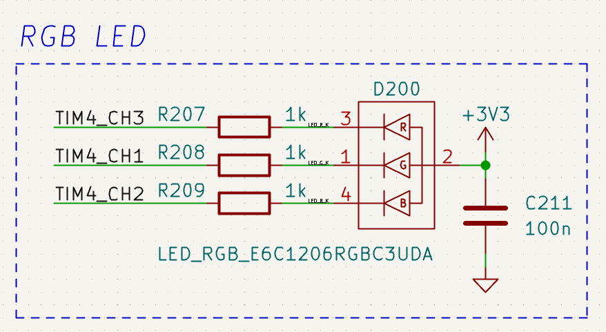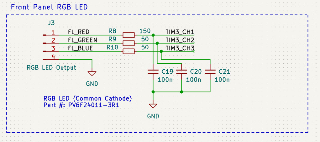 I chose the resistor to draw about 10mA on full brightness. I'm not sure if I placed the capacitors in correct way. The TIM3 CHX nets are connected directly to MCU PINs.