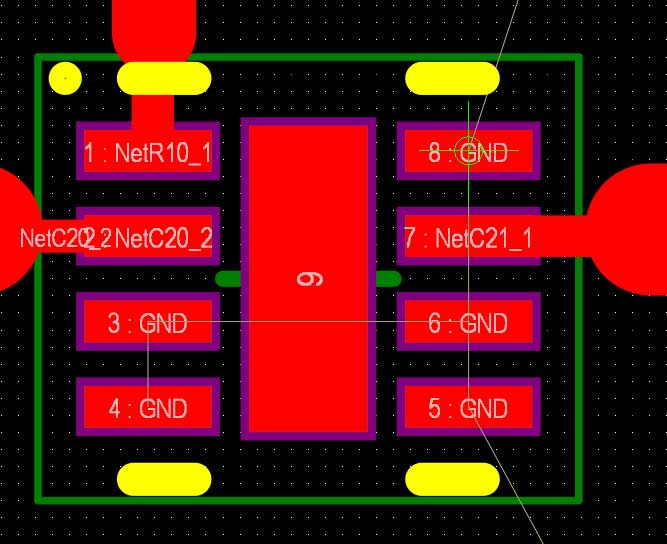 Also, I wonder why pin 9 doesn't have a net assigned. In some cases it can be left unassigned, but it's typically assigned ground. Experimentally, you might select it and manually assign it the ground net. Then, see if it gets easier to start a route from pin 4 or 5.