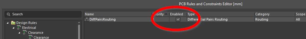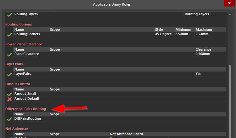 Each rule "DiffPairsRouting_..." is enabled.