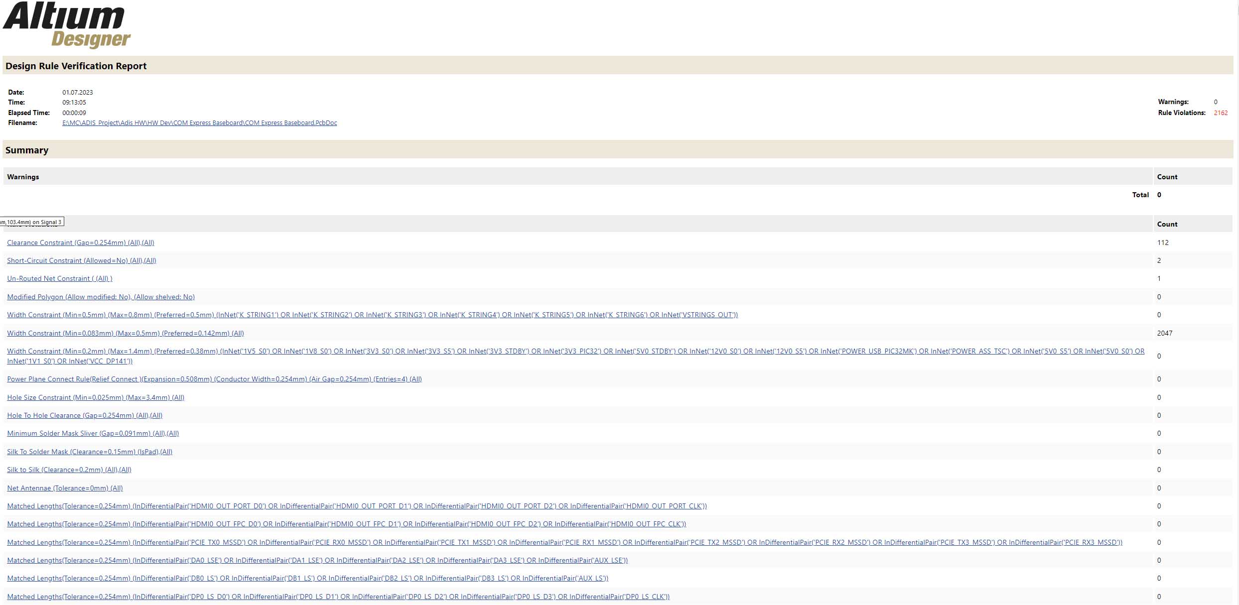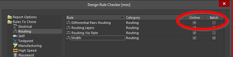 The Design Rule checker says that everything is unchecked except Width that is checked for Batch.