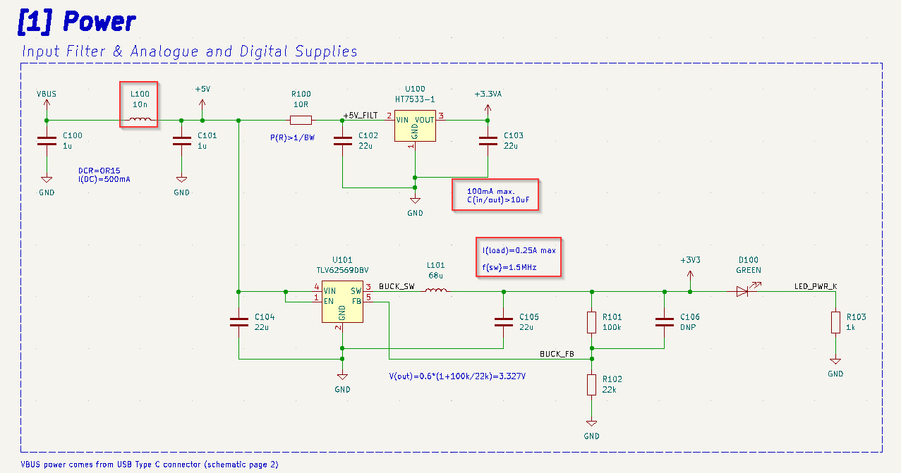 I'm currently doing a thorough review of my mixed-signal PCB schematic and I overlooked a couple of things when initially selecting components (as you do). Where possible, I've tried to stick to JLCPCB basic parts to keep the cost down, but sometimes it just seems unavoidable to pick extended parts. In particular, I'm trying to understand the maximum current rating of inductor L100 at the input filter for the analogue and digital supplies. I originally picked a 10nH, 300mA inductor, because that's the maximum current limit that JLCPCB offer as a basic part on their inductors.