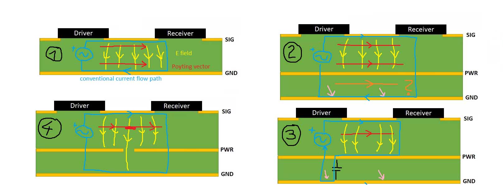 Lastly on picture 4 when we have cut in the PWR then in that place the E-field goes between SIG and GND and we have impedance mismatch, this is right understanding, right?