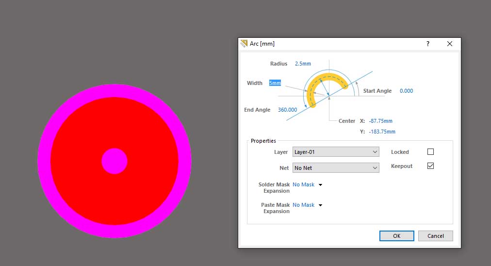 For the keepout region you need it to be a filled circle which covers the fiducials and solder mask expansion. However, in Altium you can't draw a filled circle so you have to cheat it. You can draw an arc, which is a part of a circle with parameters angle, radius and width of the line. To make a full filled circle, you need to make the arc 360 degrees, give it a radius of D/4 (D is the diameter of the filled circle you need) and give it a line width of D/2. Arc is one of the standard drawing elements available from the Place menu. Here is an example of a keep-out region used for the fiducial (the diameter in the example is 10mm because it is just an example, with the actual fiducial I am using 3mm):