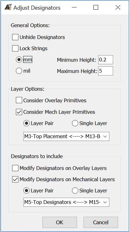In Layer Options, you can chose the reference for the component size. I am using the courtyard mechanical layer (also used in the assembly drawings) for the purpose. According to the component size determined by the selected layer primitives, the script automatically adjusts the font size of the designators.
