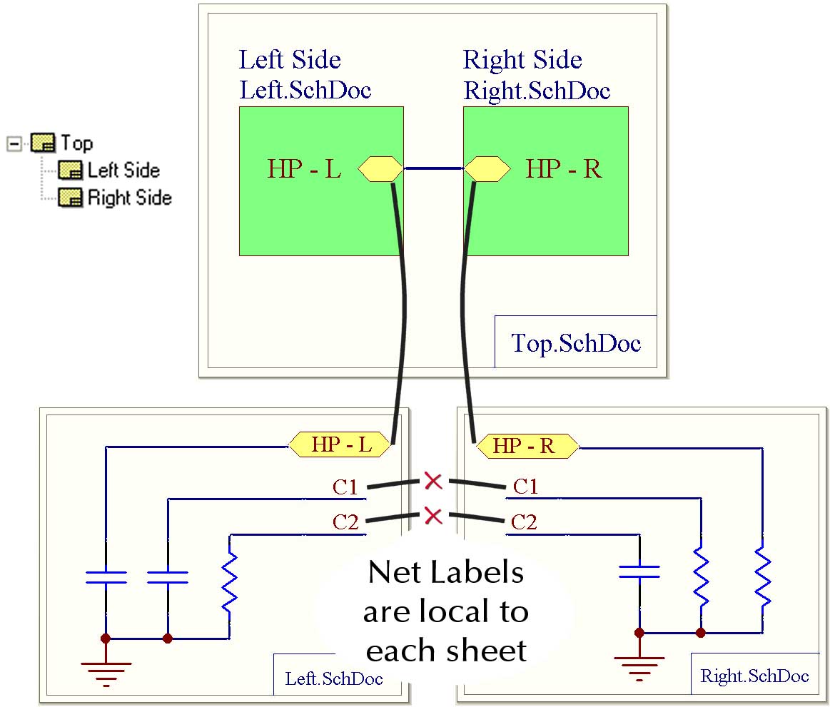 2. If you want to have just a visual hierarchy in the project, so that there is some sort of a logical structure, you can keep all nets to global, so that they connect across all the sheets. Then 2 nods will connect to each other automatically as long as they have the same net label.