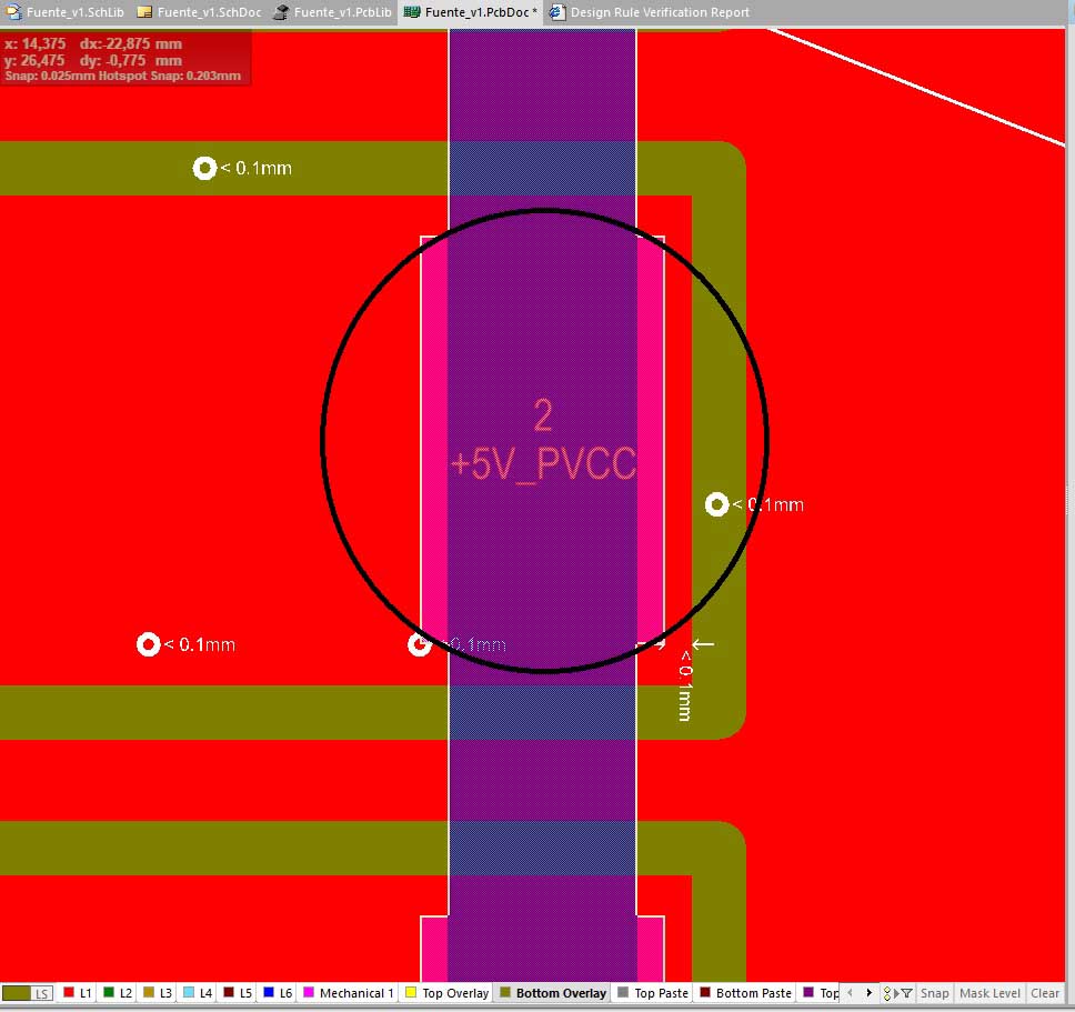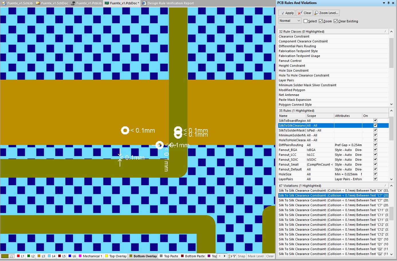Hi guys! During Switching Power Supply course I found a problem with two errors in particular that I can't avoid!. It seems like Altium doesn't allow to overlap "text" (of the component, hidden for a more comfortable design) with a via or a bottom/top overlay layer (Silk to Silk error Clearance constraint). I believe this is not important as Robert did not have bottom overlay visible during design. Also, I get another error when overlaping text with pads of any component (Silk to Solder Mask error). What'silk? Sorry for these new starter questions; I'll let the pictures describe what's going on. THANKS A LOT!