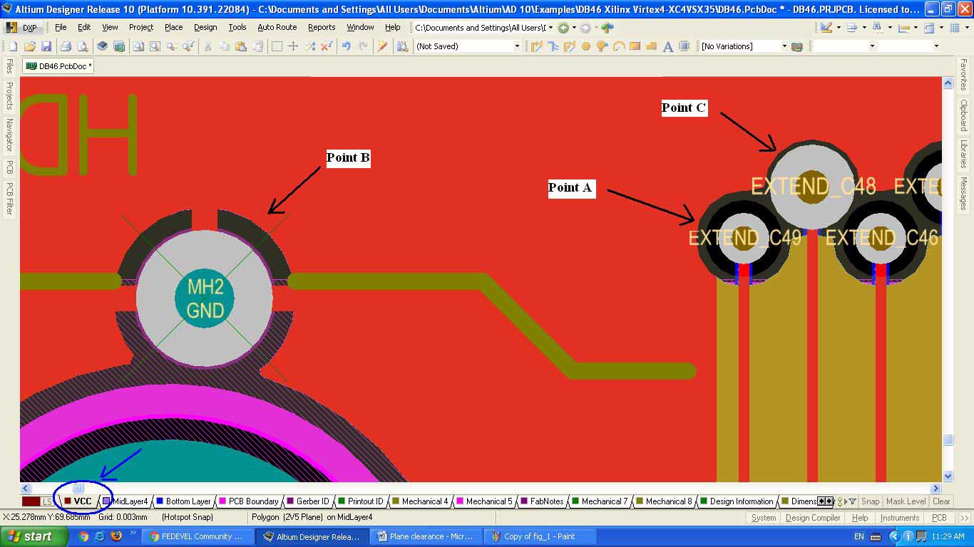 None of these should be connected to VCC plane. While Point C and Point B , apparently connected to VCC plane.