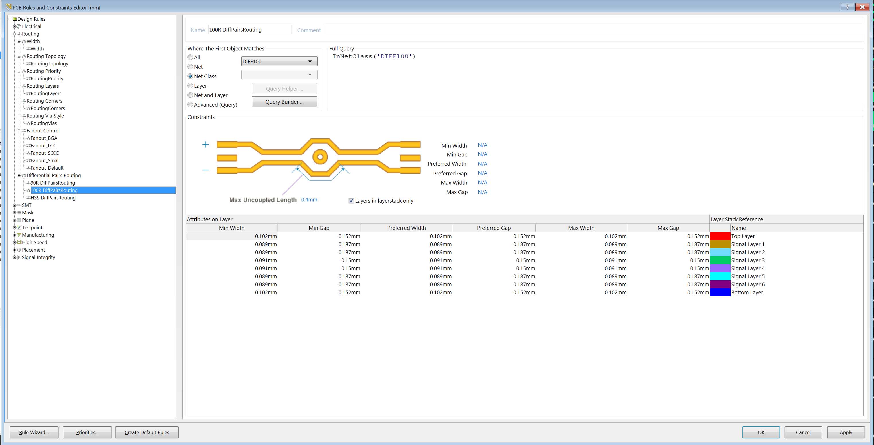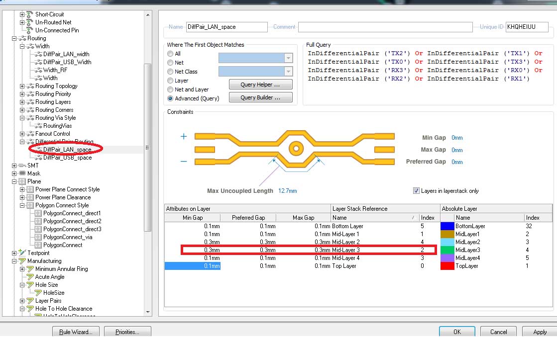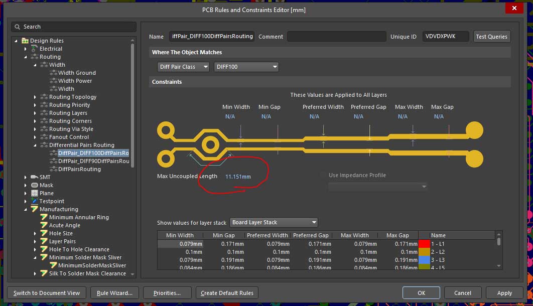I have a problem with Altium. The differential pairs routing rule doesn't seem to be working properly. The part about the width and gap specification seems to work fine - I can route pairs and they turn out to have the right dimensions. However, the Max Uncoupled Length field doesn't seem to be doing anything. Even if I put it to a very low value, it never detects sections that exceed the specified maximum gap. The rule is definitely enabled in the rules and also it is enabled for batch checking under Tools > Design Rule Check > Rules to check. When I run the DRC I never get error about the differential pairs.