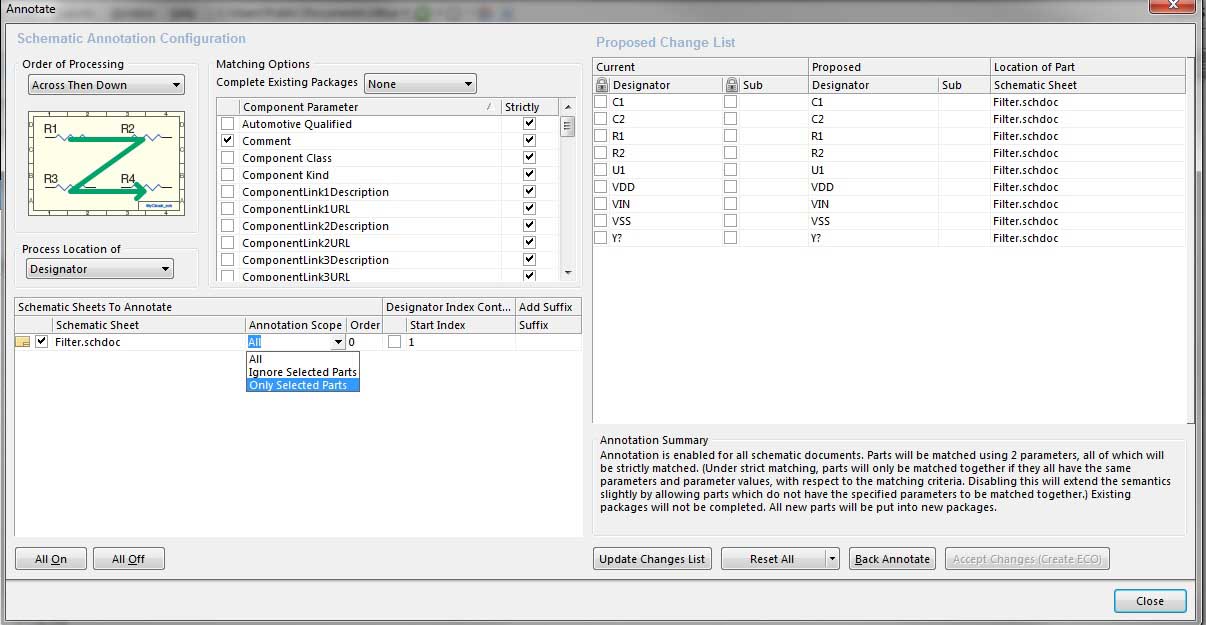 Hi In addition to Robert Solution ( that is exactly true) you can select component in Schematic and set Annotation Scope to "Only Selected Parts" as shown in attached picture Best Regards.