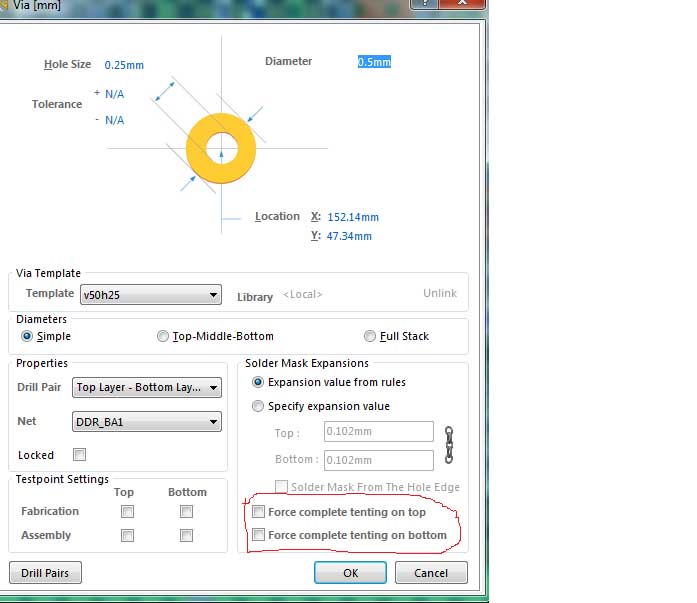 - Force complete tenting on bottom - The term tenting means to close off. If this option is enabled then the settings in the applicable solder mask expansion design rule will be overridden, resulting in no opening in the solder mask on the bottom solder mask layer for this via. When this option is enabled, the Expansion value from rules and the Specify expansion value options are ignored.